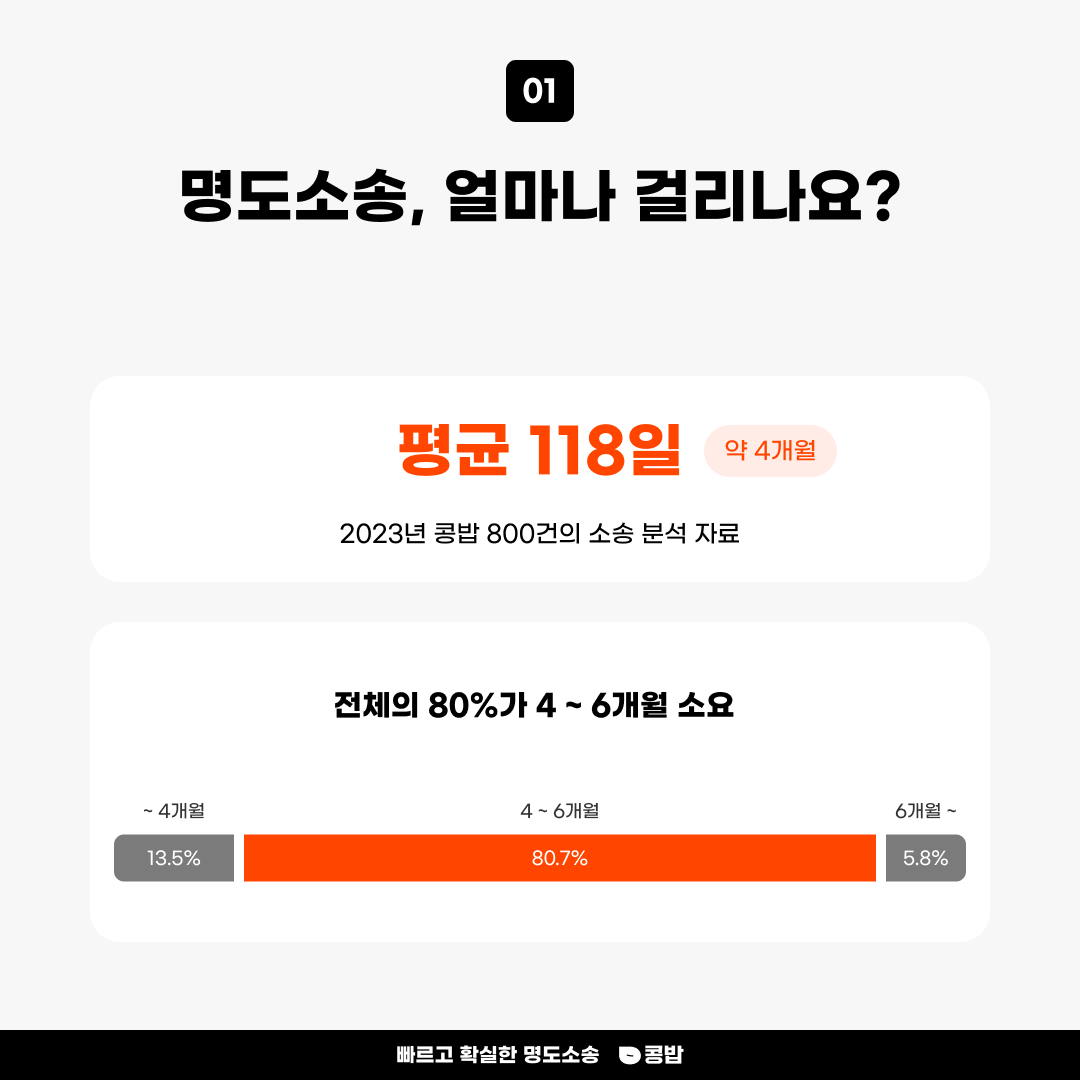 4개월 내외로 명도가 완료되는 경우가 80%로 가장 많았습니다. 다만 상황에 따라 달라질 수 있는데요. 2-3개월만에 더 빠르게 끝나는 경우도 있으나, 반면 속도가 느린 경우, 6-9개월 가량 걸리는 경우도 있습니다.