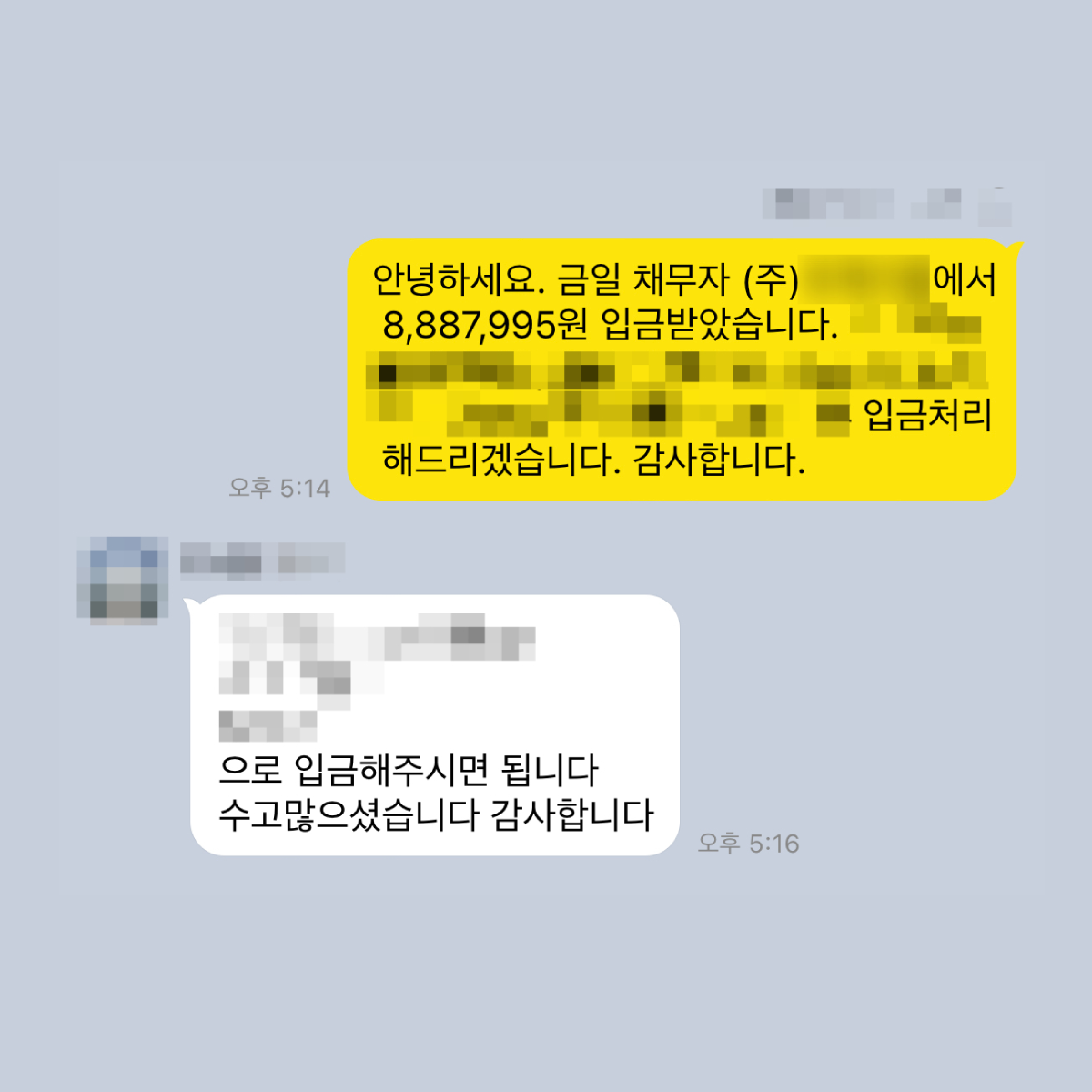 - 8개월간의 철저한 대응 끝에, 원금과 지연이자까지 포함한 전액을 회수할 수 있었습니다.