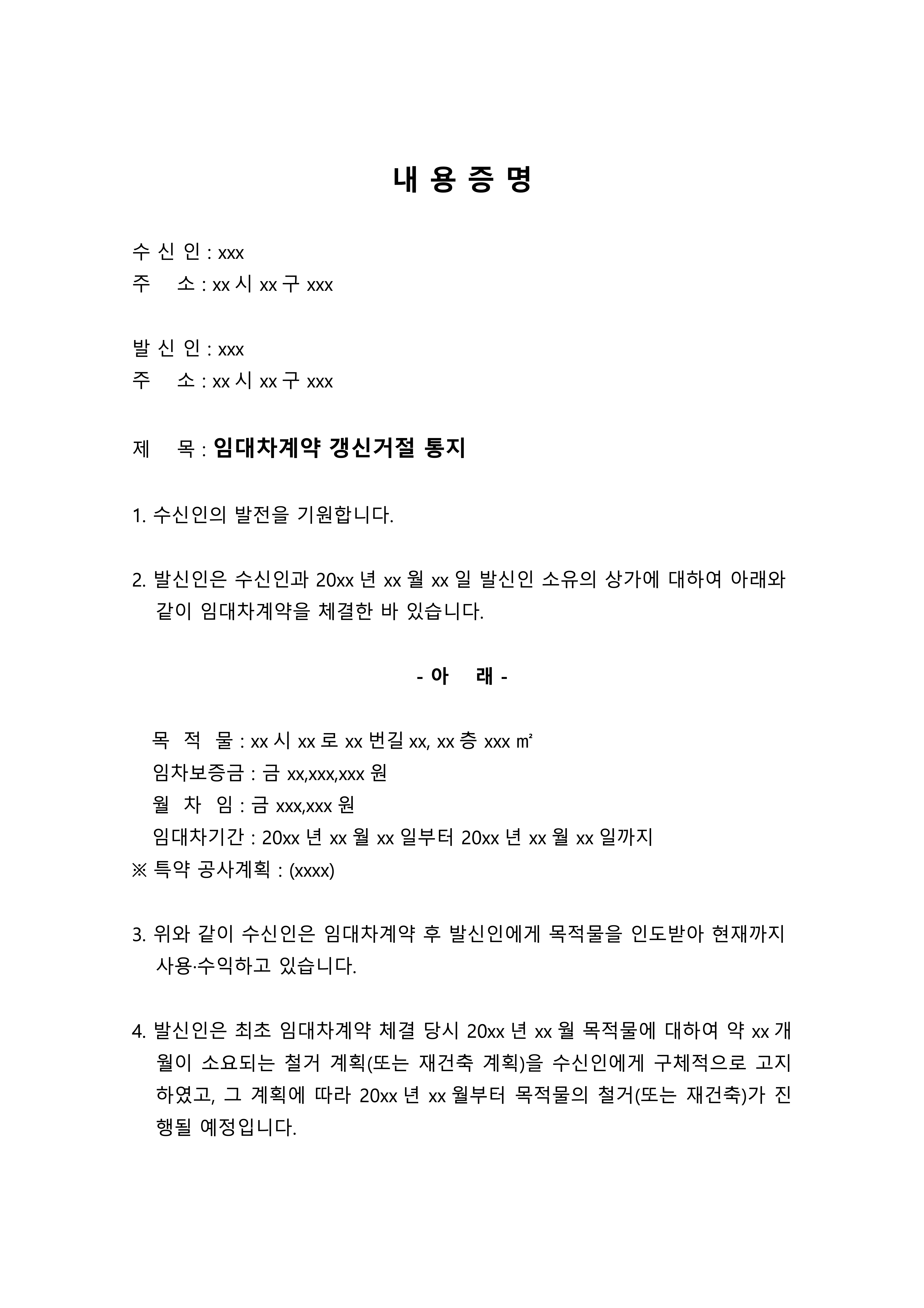 상업용 부동산에서 철거 및 재건축을 사유로 갱신을 거절하고자 하는 경우, 발송하는 내용증명 양식입니다.
