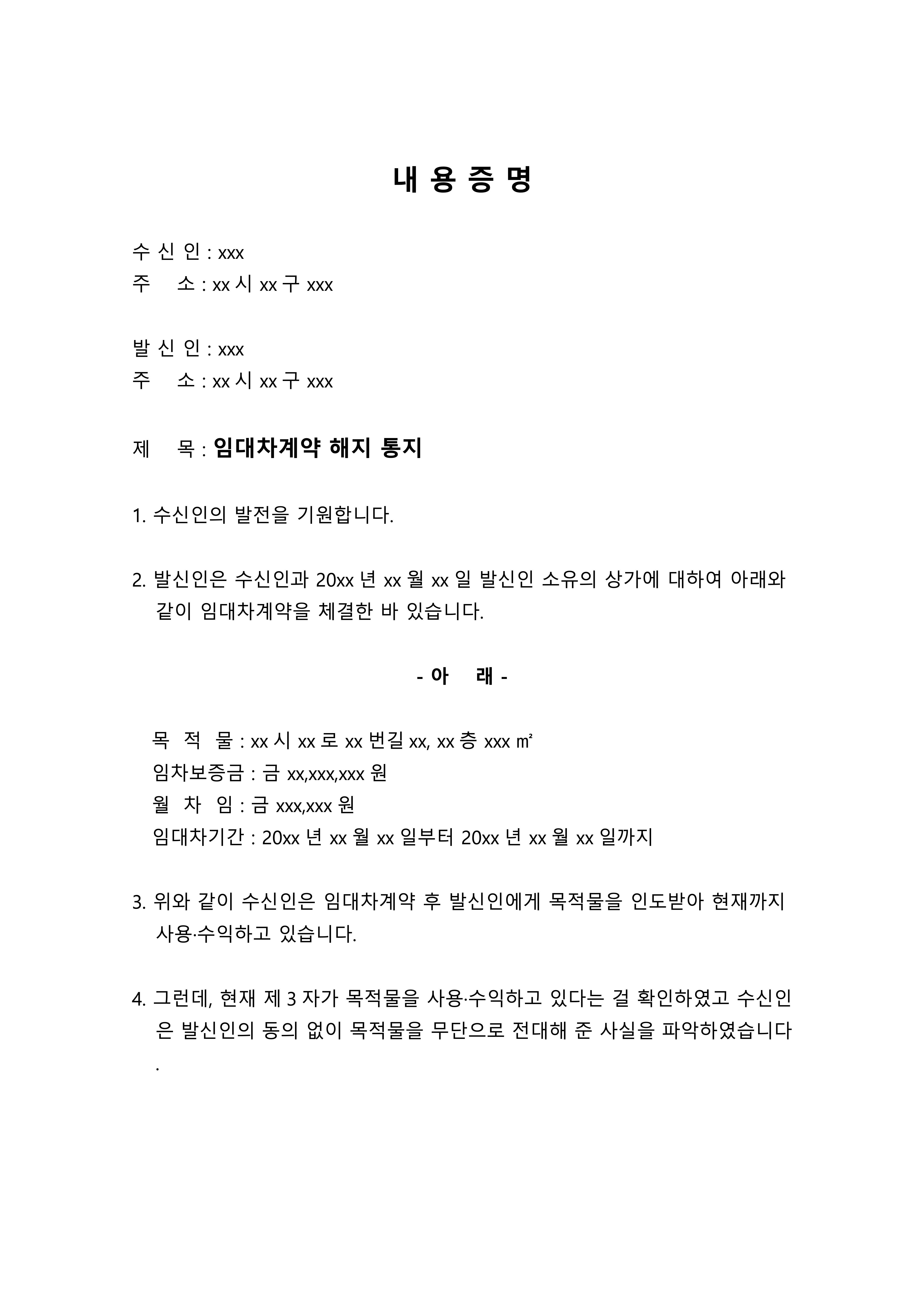 상업용 부동산에서 무단전대를 사유로 갱신을 거절하고자 하는 경우, 발송하는 내용증명 양식입니다.